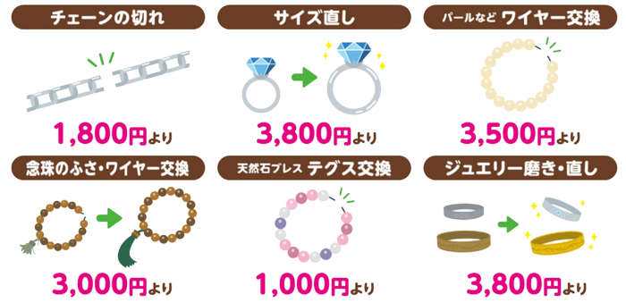 ※上記料金は、基本料金です。修理品のデザインや内容によって価格が変わりますので、スタッフまでおたずねください。